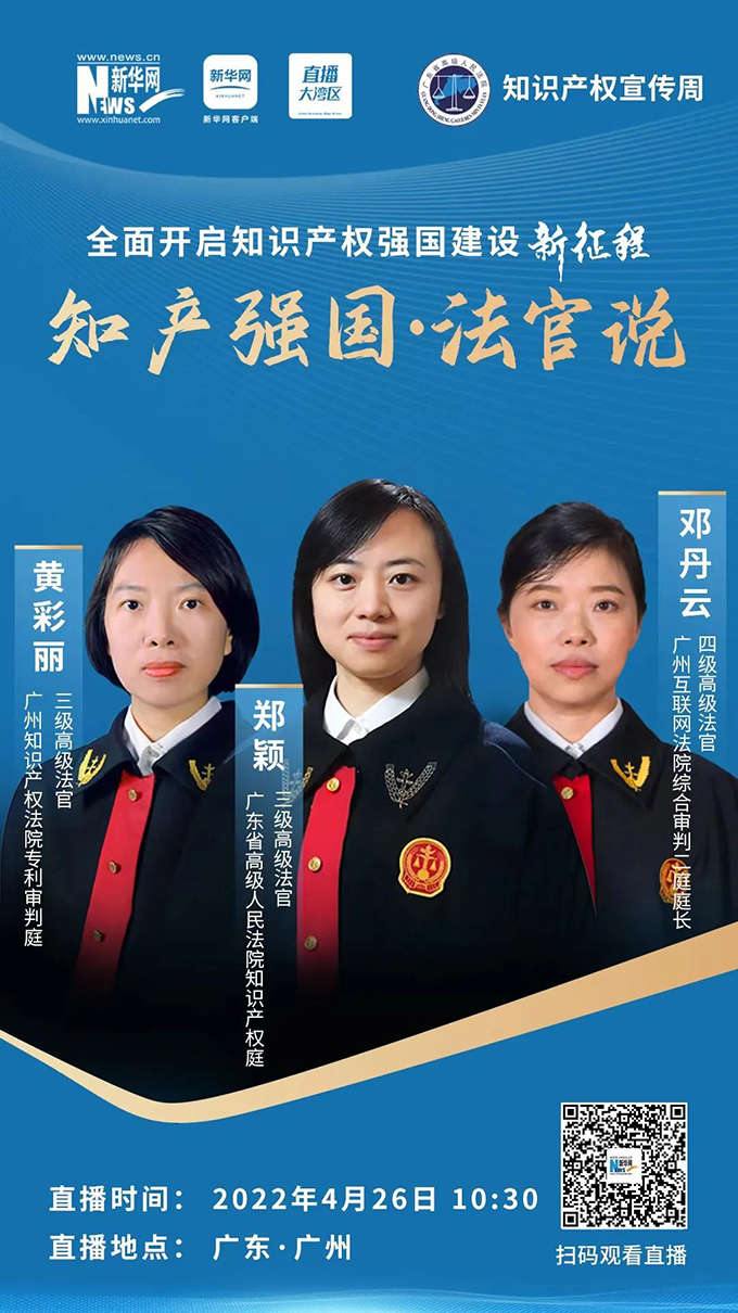 4月26日,是第22个“世界知识产权日”,广东法院与新华网联合开展“知产强国·法官说”为主题的网络访谈活动。来自广东省高级人民法院、广州知识产权法院、广州互联网法院的三位法官,在线回应网友关注、解读法律法规,为网友呈现了一场法治公开“云课堂”,获131.7万网友在线围观。