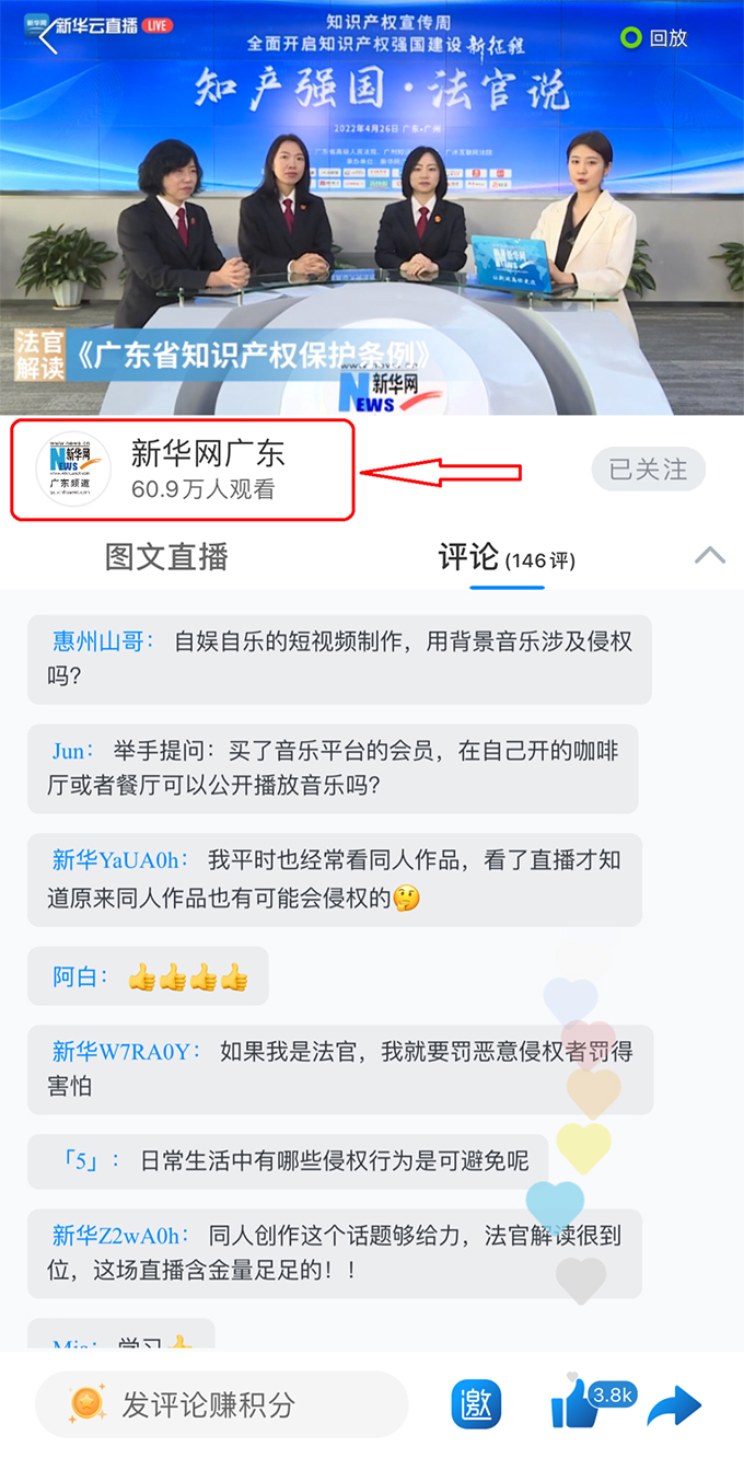 直播活动于4月26日上午10:30正式开始。直播中,三位法官围绕《广东省知识产权保护条例》、商业秘密保护、知产案件技术查明、同人创作等问题分别进行了在线解读。同时,结合网友提出的“未经许可引用他人拍摄的图片或视频是否构成侵权”“在音乐平台付费购买后是否可以公开播放”“截图网络文字和图片发给他人是否构成侵权”等18个问题,采取以案说法的形式为网友解答身边的知识产权保护。